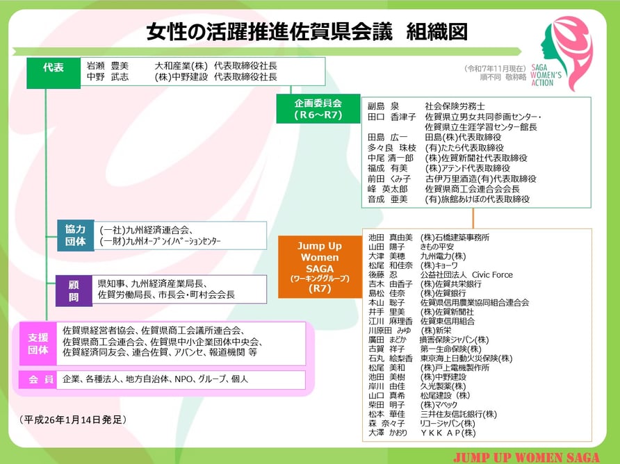 SAGA WOMEN'S ACTION(女性の活躍推進佐賀県会議)の取組を進めるため、県内各企業から集まったメンバーがJump Up Women SAGA (※)を組織し、「重点活動項目」に資するセミナーの開催や県内における調査などを経済界のリーダー(企画委員会)の下、核となり活動しています。